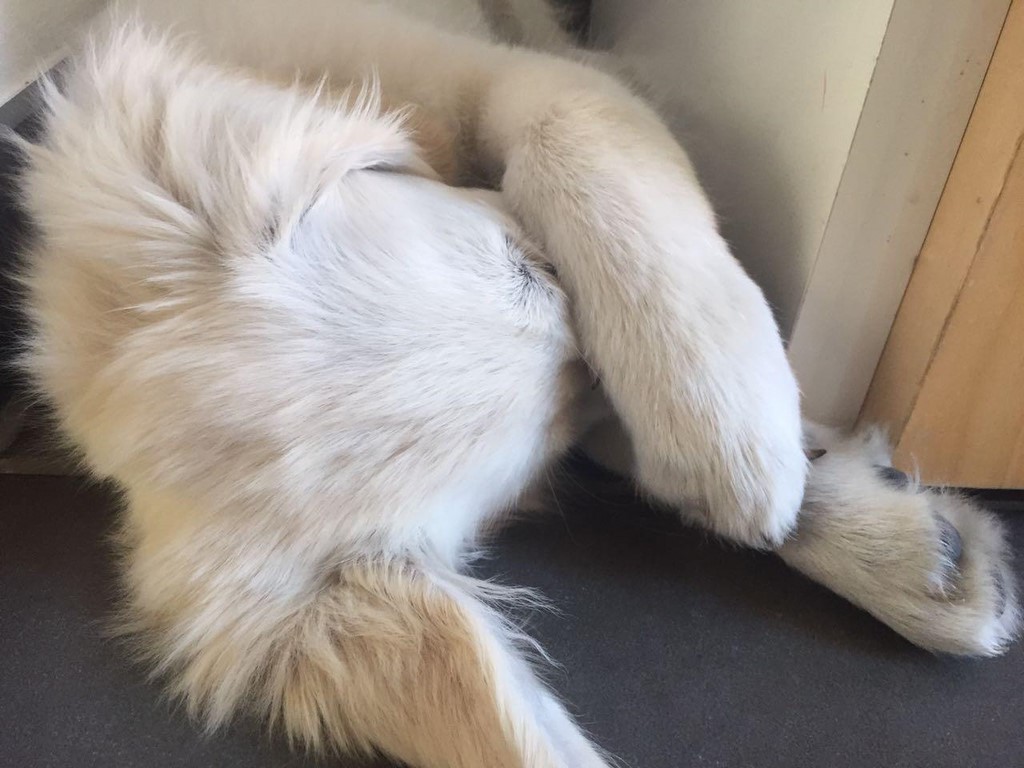 Er hat einen Rückzugsort (verschließbare Hundebox) im Klassenzimmer von Frau Wiemer.