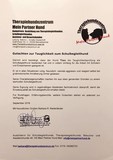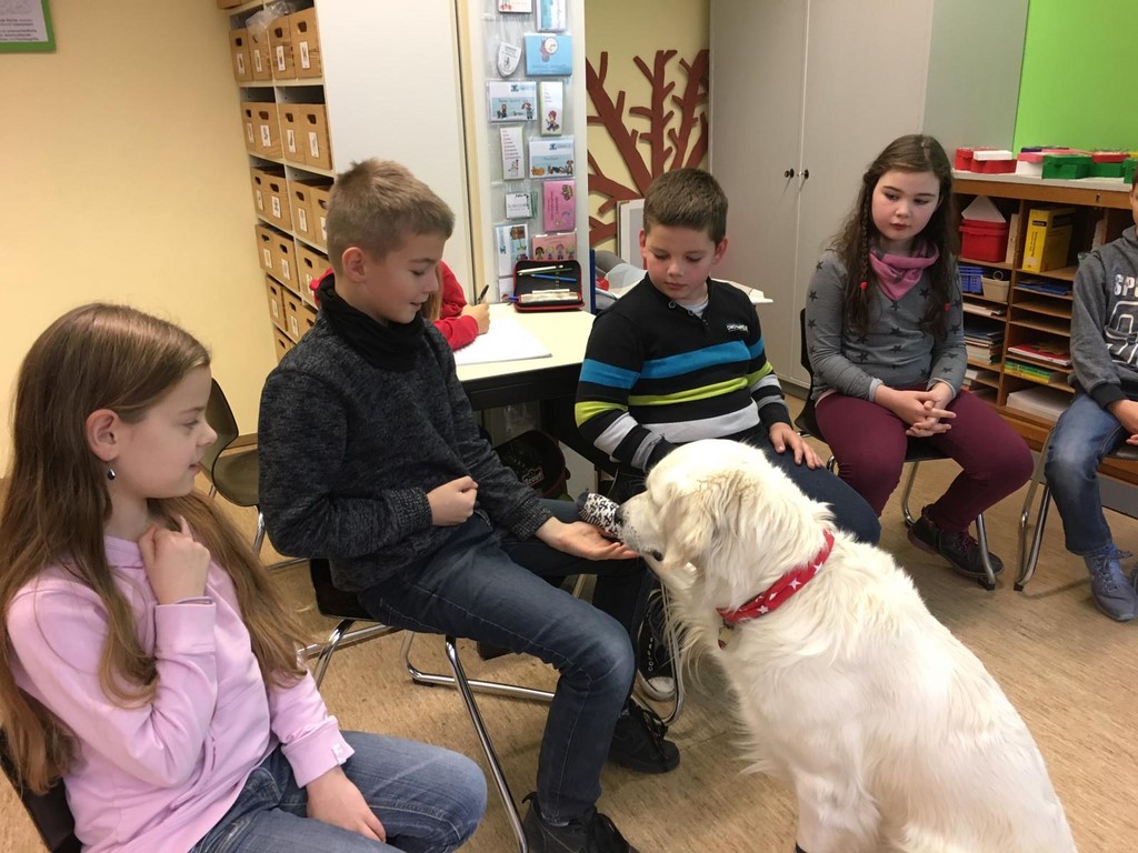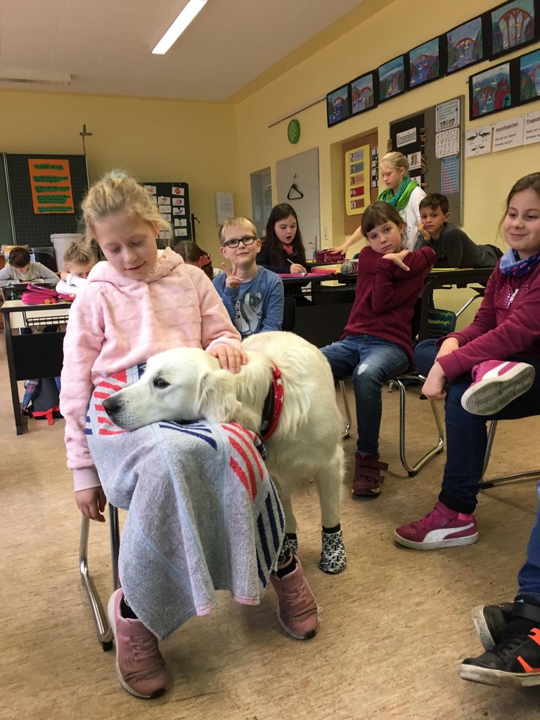 Theo begleitet Frau Wiemer ein- bis zweimal in der Woche in die Schule und wird ausschließlich von ihr geführt. Er wird niemals unbegleitet mit den Kindern arbeiten.