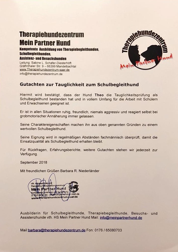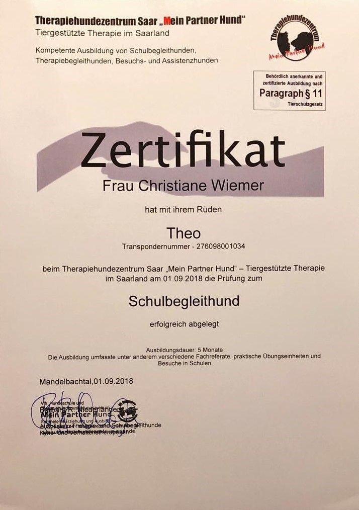 Theo besucht mit seiner Halterin seit dem Welpenalter die Hundeschule DOGS in Bad Dürkheim. Im März 2018 haben sie seine Ausbildung als Schulbegleithund im Therapiehundeausbildungszentrum "Mein Partner Hund" begonnen und am 07.12.2018 erfolgreich abgeschlossen. Dabei zeigte sich Theo "in allen Situationen ruhig, freundlich, niemals aggressiv und reagiert selbst bei grobmotorischer Annäherung immer gelassen" (Gutachten zur Tauglichkeit).